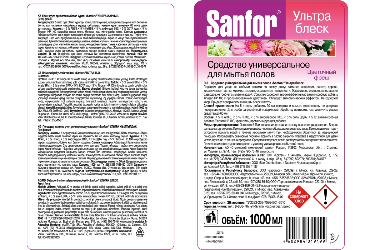 Универсальная моющая жидкость для полов Sanfor Цветочный фреш - идеальное решение для эффективной влажной уборки. Безопасен и подходит для мытья любых типов напольных покрытий: от керамической плитки до деревянного паркета, включая ламинат, линолеум, кафель, пластик, дерево, мрамор, окрашенные поверхности и многое другое.