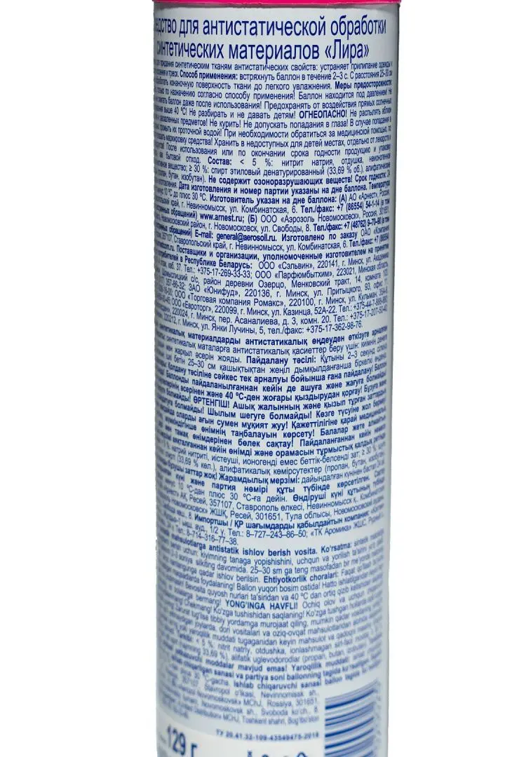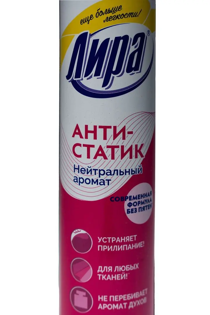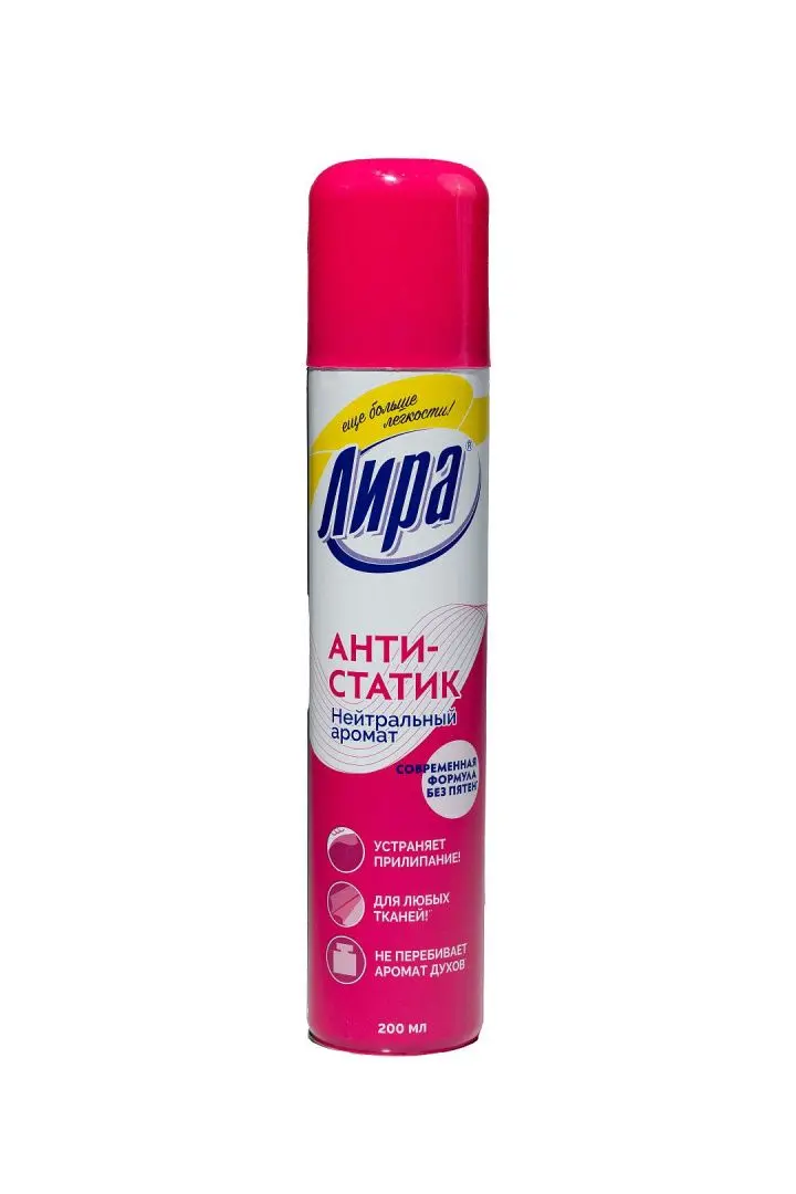 /шт.Антистатик Лира Нейтральный аромат 200 см3.Для снятия электрического напряжения одежды, пластмасс, полимерных покрытий, а также штор, ковров, мебели.Срок годности: 18 мес.ТУ 2382-055-00204263-2004